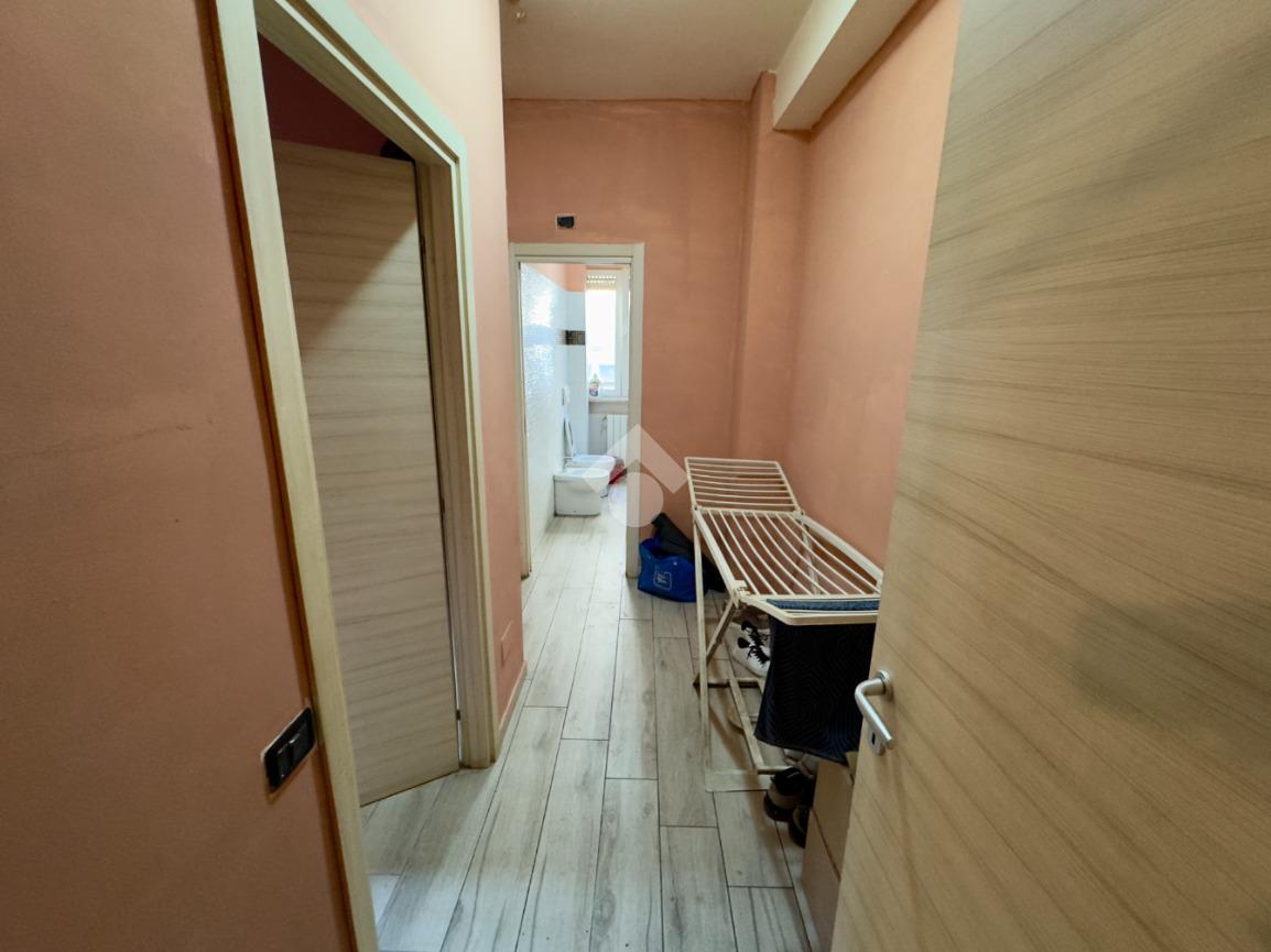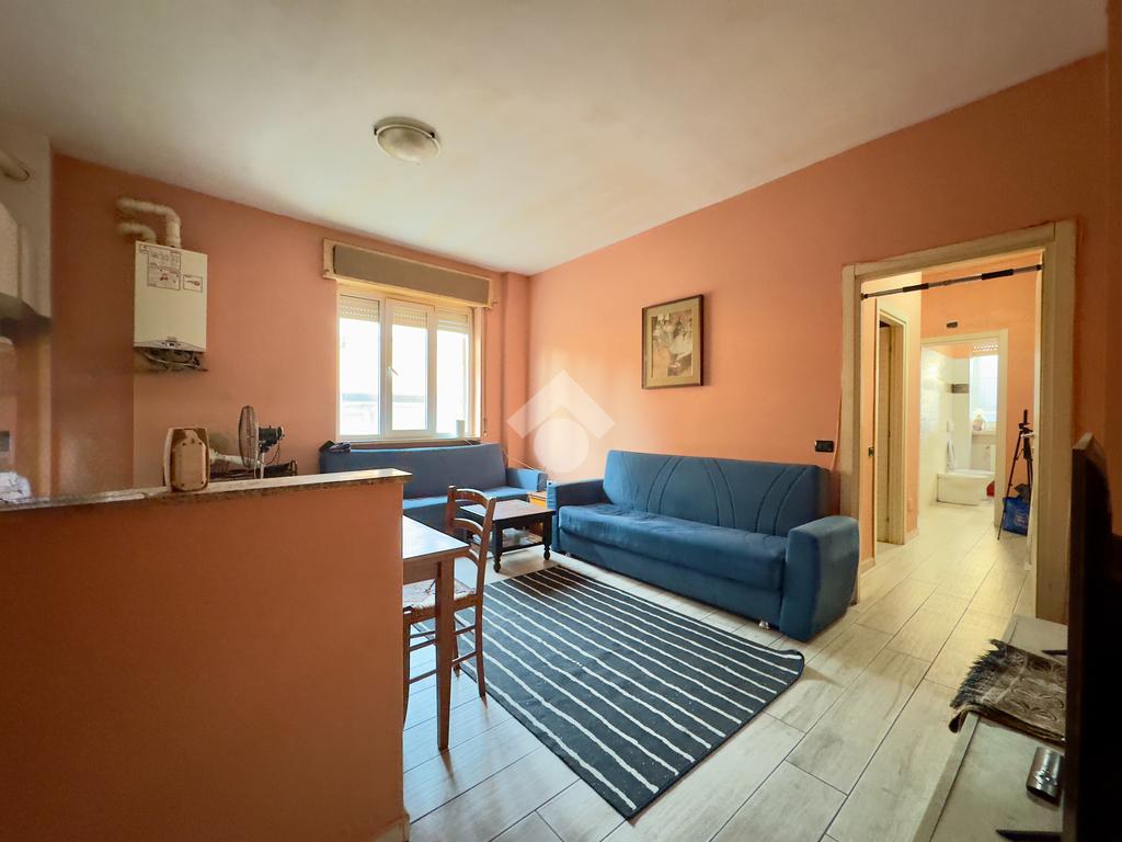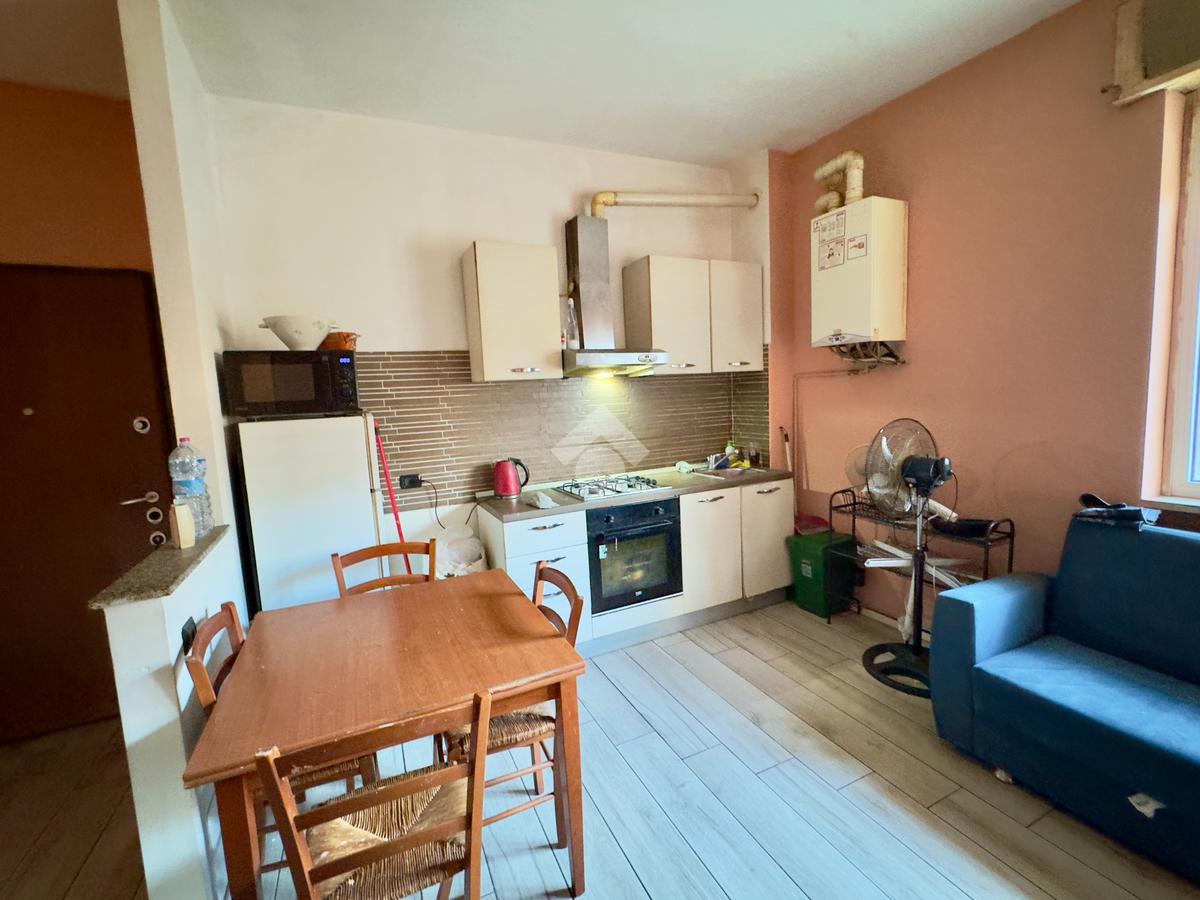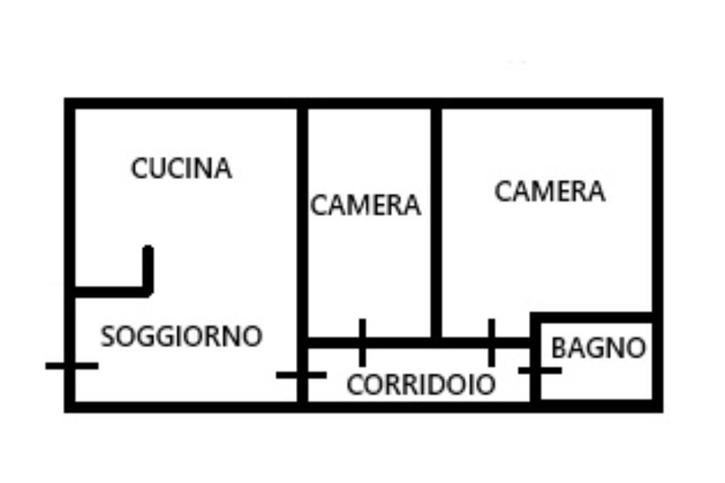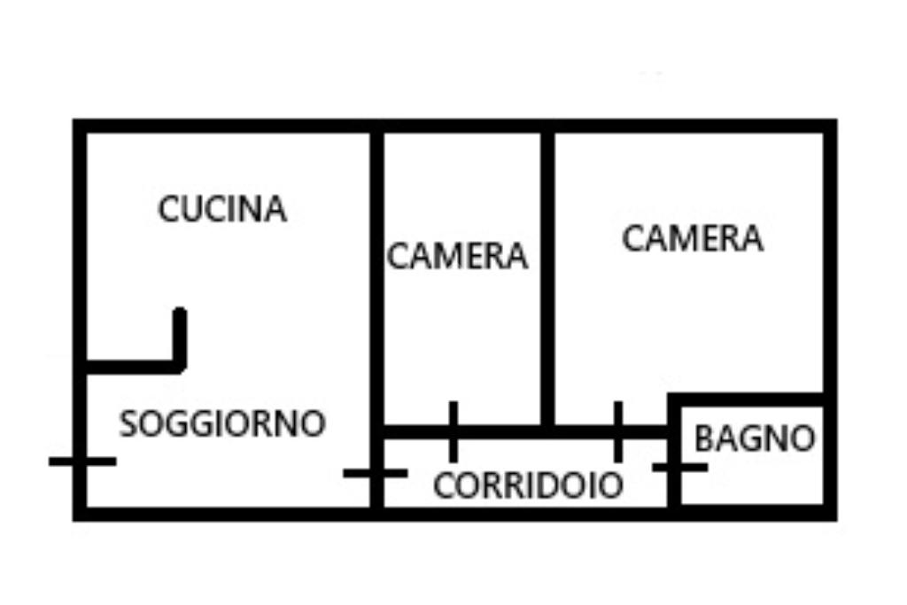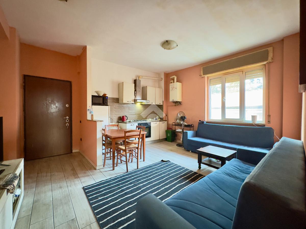 L’abitazione si apre su un ampio atrio d’ingresso che conduce al luminoso soggiorno con cucina a vista. Un pratico corridoio accompagna alla zona notte, composta da una camera matrimoniale, una camera singola e un bagno finestrato dotato di box doccia.
